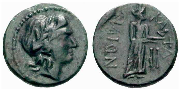 | Calciati 22 | Katane, Sicily. After 212 BC. AE 20mm. Jugate busts left of Serapis and Isis / KATANAION, Apollo standing facing in chlamys, left elbow resting on a pillar, holding branch in right hand, bow in left, at his feet left an omphalos and quiver. SNGCop 190-192. | Text | ![]() |