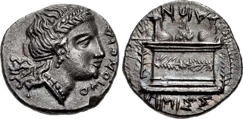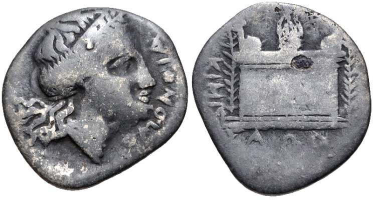 | Jameson 559 | Kimissa, Sicily, AR Hemidrachm, ca 339-336 BC. 14 mm, 1.98 g. OMONOIA to right of head of Homonoia right, wearing single-pendant earring and pearl necklace. / KIMIΣΣAIΩN around burning, garlanded altar, surmounted by two horns; palm branch to left and right. Campana 1a (this coin); Hoover HGC 656; Jameson 559 (this coin). | Text | Image |