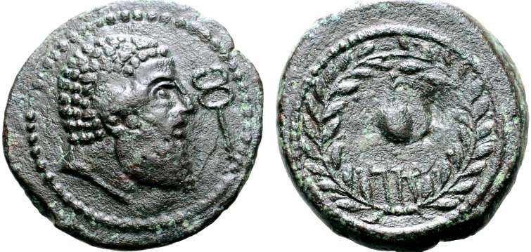 | SNG Morcom 936 | Melita (Malta), Autonomous issue, AE22, late 3rd century BC. 6.24g. Head of Eshmun or Herakles right, caduceus before head / Sacrificial myrte cap within wreath, Punic A below. Calciati 1; SNG Cop (Vol. 8, N. Africa) 455-457; Laffaille 269; SNG Evelpidis 737; Dreer 602; Lindgren I 658; SNG Morcom 936. | Text | Image |