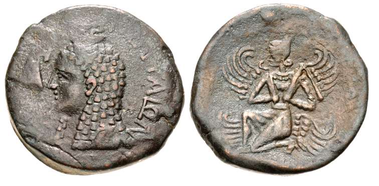 | Calciati 7 | Melita (Malta), Islands off Sicily. AE26. Ca 150-146 BC. 14.39 g. MEΛITAIΩN, head of Isis left wearing uraeus; symbol of Tanit to left. / Four-winged figure of Osiris kneeling left, holding flail and sceptre. Calciati III 7; SNG Cop 463 (North Africa); Virzi 2140; Sear SG 6588. | Text | Image |