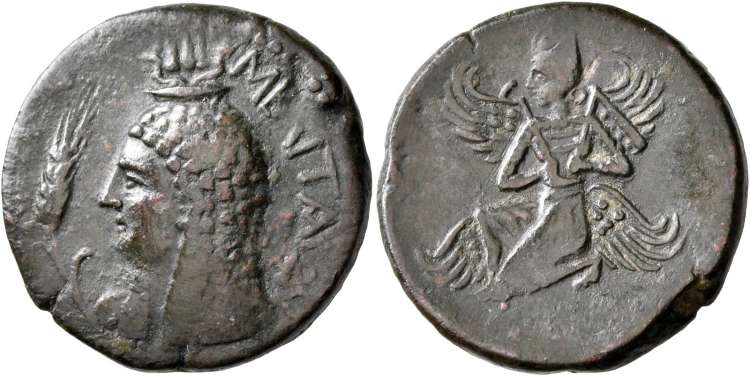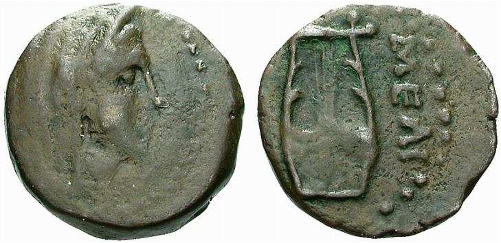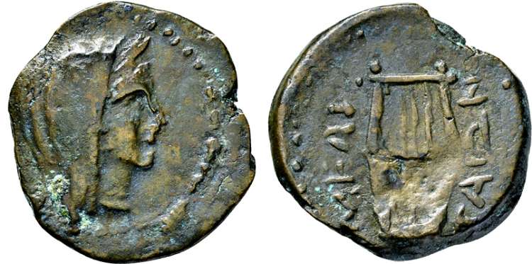 | Calciati 13 | Melita, Sicily, AE triens, 89 BC. Veiled head of Demeter right, wreathed with corn / MEΛI-TAIΩN to right and left of lyre. Calciati 13; Lindgren II, 664 (this coin); SNG Cop (North Africa) 469-470; SNG Evelpidis 749; Virzi 2146-2147. | Text | Image |