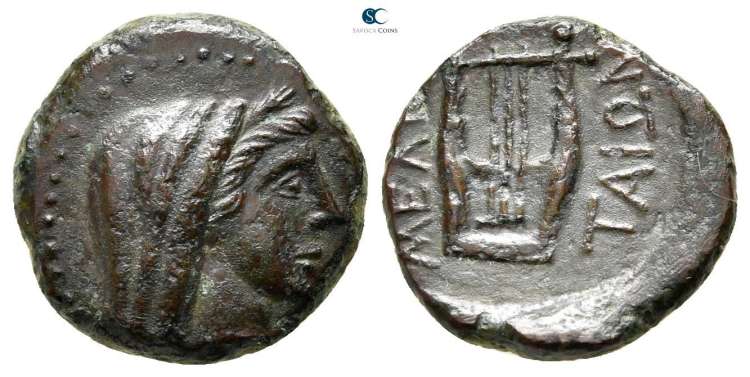 | SNG Cop 470 | Melita, (Malta) Island off Sicily. AE18 civic issue, 218-175 BC. Veiled head of Demeter right, wreathed with corn. / MEΛI-TAIΩN, lyre. SNG Cop 470. | Text | Image |