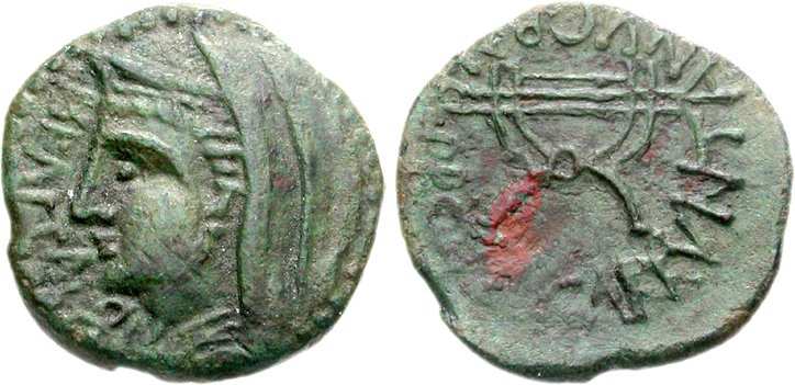 | Calciati 14 | Melita, Sicily, AE Semis, 44-36 BC. 5.32 g. C. Arruntanus Balbus, propraetor. MEΛITAIΩN, veiled and draped female bust (Astarte?) left, wearing stephane. C ARRVNTANVS BALB PROPR (RV ligate), curule chair. RPC I 672.39 (this coin; Calciati 14; SNG Hunter 212-213; SNG Evelpidis 750-751; Laffaille 272; SNG Cop (North Africa) 473-474. | Text | Image |
