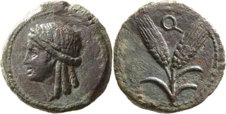 | SNG Morcom 888 | Melita, (Malta) Island off Sicily. AE18 civic issue, 218-175 BC. 3.27 g. Head of Apollo left with formal curls, hair bound in a taenia / Two corn-ears on one stem, Koppa above. SNG Morcom 888. | Text | Image |