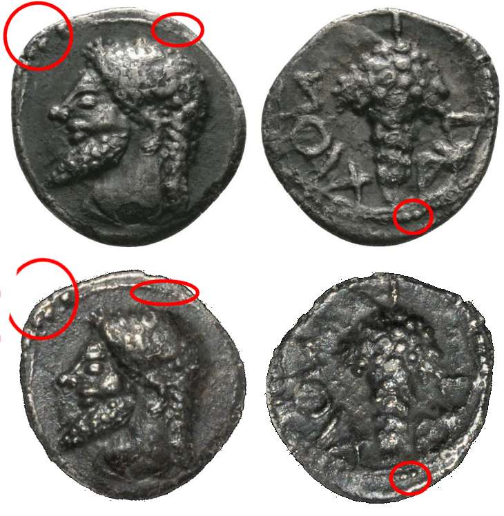 | FAKE Cahn 12-32 | FAKE Naxos AR Litra. Copying : 530–510 BC. Archaic head of Dionysos left, wreathed with ivy. / NAXION (retrograde), bunch of grapes. FAKE COPY of Cahn 12-32; SNG ANS 513; Hoover HGC 967. Two fakes from the same "dies" with the same artificial wear and damage. | Text | ![]() |