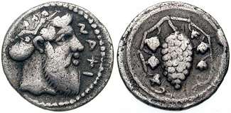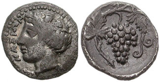 | Cahn 104 | Naxos, Sicily AR Litra. ca 420-415 BC. Bearded head of Dionysos right, wearing taenia decorated with ivy branch / bunch of grapes. SNG ANS -; cf. Winterthur 764. | Text | ![]() |