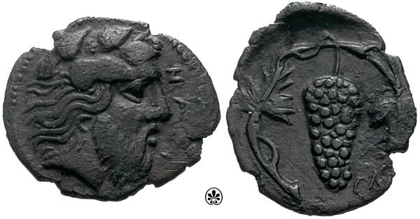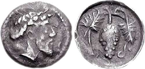 | Cahn 134v | Naxos, Sicily AR Litra. ca 420-403 BC. Wreathed head of a young Dionysos left / bunch of grapes with leaves and tendrils. SNG ANS -; SNG Lloyd 1161; SNG Copenhagen 496. | Text | ![]() |