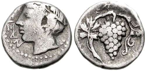| Cahn 39 | Naxos, Chalcidian drachm circa 500, AR 5.68 g. Ivy-wreathed head of Dionysus left, with pointed beard and hair in form of dots, falling in waves over neck. / NAXION, Bunch of grapes hanging from stalk between two leaves. Kahn 39; Jameson 672. SNG ANS 514. SNG Lloyd 1147. | Text | ![]() |