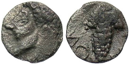 | Sear 728 | Naxos, Sicily, AR litra. 0.93 gr, 11.47 mm. 530-490 BC. Bearded head of Dionysos left with pointed beard and long hair / NASION, bunch of grapes. Sear 728; Kahn 19; BMC 6. | Text | ![]() |