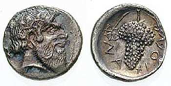 | Manganaro 40 var | Naxos, Sicily AR Tetras or trionkion. ca late 5th Century BC. Amphora; three dots around / NAXION; bunch of grapes. Manganaro 40 var (city name); SNG ANS 1360 var (ditto); Hoover HGC 979 var (ditto). | Text | ![]() |