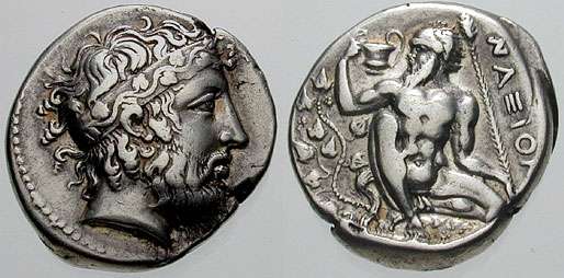 | Weber 1470 | Naxos, Sicily. ca 420-415 BC. AR Tetradrachm. Bearded head of Dionysos right, in taenia decorated with an ivy branch / NAXION, nude & bearded Silenos squatting right on rocks, head left, holding kantharos in right hand & thyrsos in left; ivy branch behind. | Text | ![]() |
