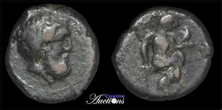 | SNG ANS 614 | Petra, Sicily, AE Drachm. 28.53mm, 30.52 gr. Ca 340-330 BC. ΠETΡINΩN, bearded head of Zeus right / Aphrodite, wearing chiton, seated right on chair, holding dove in left hand. Hoover 1097; SNG ANS 614. | Text | Image |