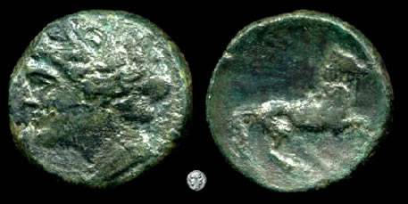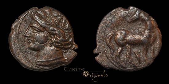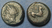 | SNG Cop 1021 | Siculo-Punic AE 15mm. ca 4th century BC. Wreathed head of Persephone-Tanit left / horse rearing to right.