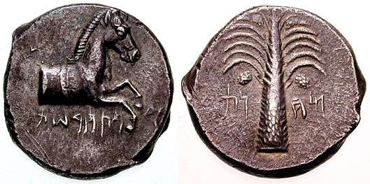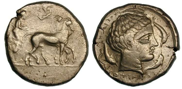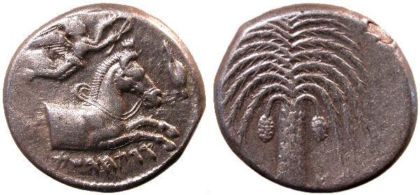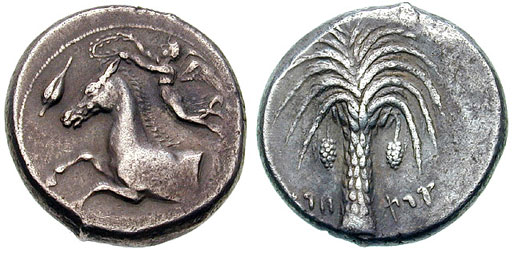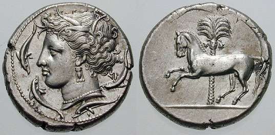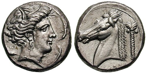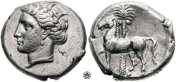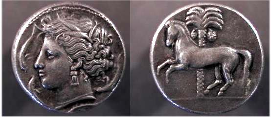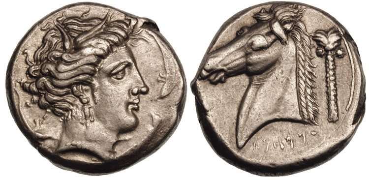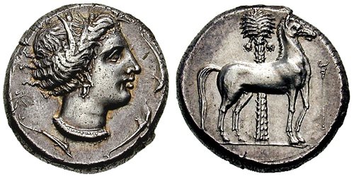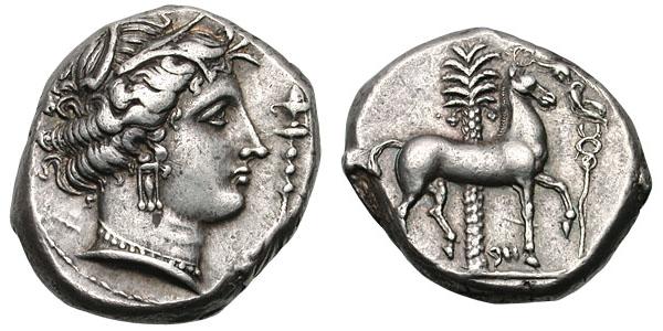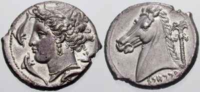 | Jenkins 2 | Sicily, Siculo-Punic AR Tetradrachm. Circa 410-395 BC. Forepart of a bridled horse right, Punic legend 'QRTHDST' below / Palm tree with two date clusters; Punic legend 'MHNT' below. McClean 3031.