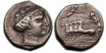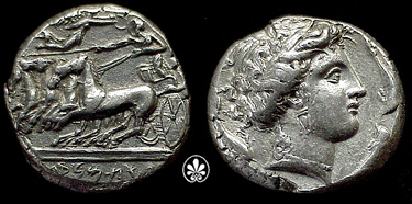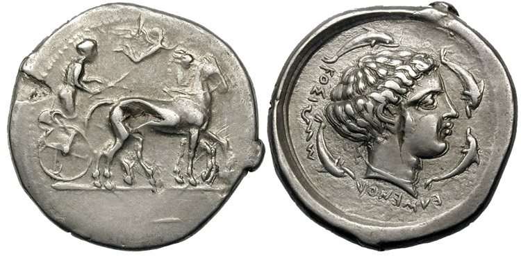 | Boehringer 254 | Syracuse, Sicily, AR Tetradrachm, contemporary imitation, possibly of Punic Sicily, c. 450-430 BC, Charioteer driving slow quadriga right, Nike flying above, crowning horses, dotted border / ΣYΡA-K-OΣA, Head of Artemis-Arethusa right in pearl diadem, four dolphins around. | Text |  |