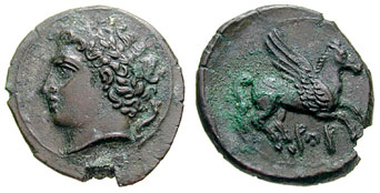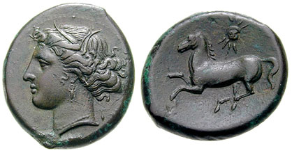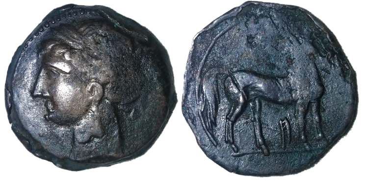 | SNG Cop 215 | Carthage, AE shekel, first Punic War. Ca 264-241 BC. 22mm, 5.92 g. Mint on Sardinia. Wreathed head of Tanit left. / Horse standing right; Punic "H" below. SNG Cop. 215; CNP 33aw; MAA 59o. | Text |  |