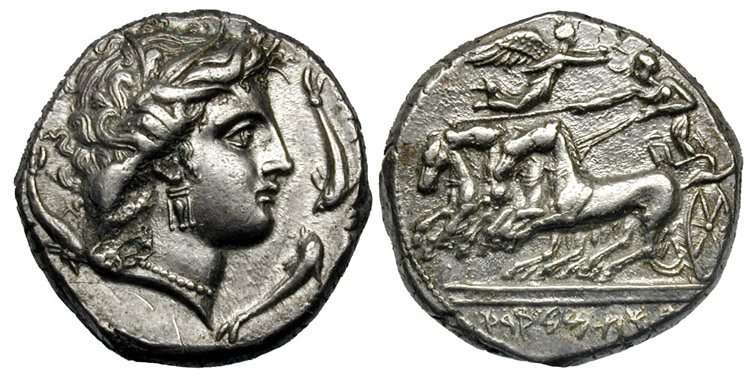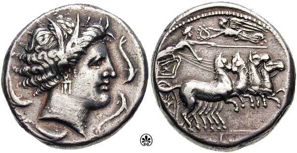 | Jenkins 70 | Punic Sicily, Rash Melqart AR Tetradrachm. ca 350-305/300 BC. Punic inscription rshmlqrt, charioteer driving fast quadriga left, above Nike flying right to crown driver / Head of Arethusa right, wreathed with grain leaves, in triple pendant earring and pearl necklace, four dolphins around. SNG Lockett 747.