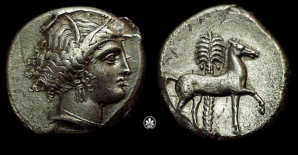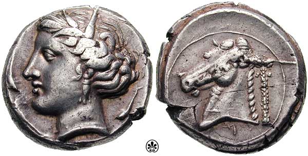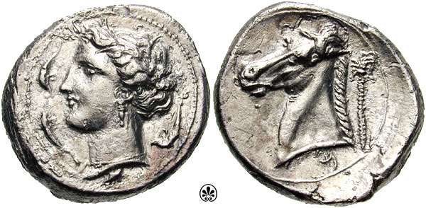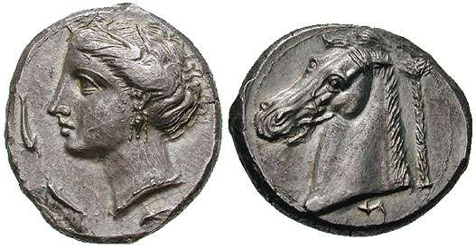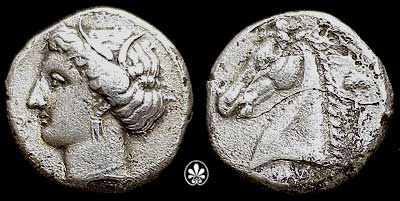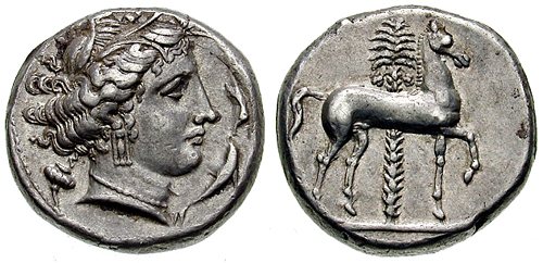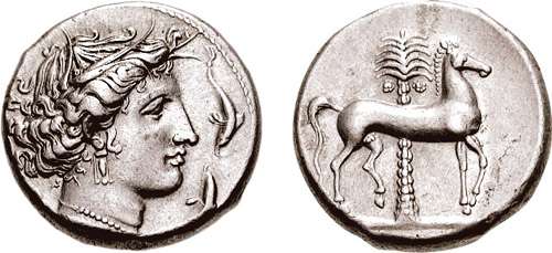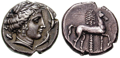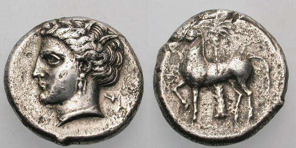 | Jenkins 427 | Siculo-Punic Carthage Shekel. 19.25mm, 6.39 g. 264 BC. Female head left with two corn-ears and leaf in hair, wearing earring. / Free horse prancing left. Jenkins 427 (same dies). | Text |  |