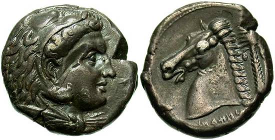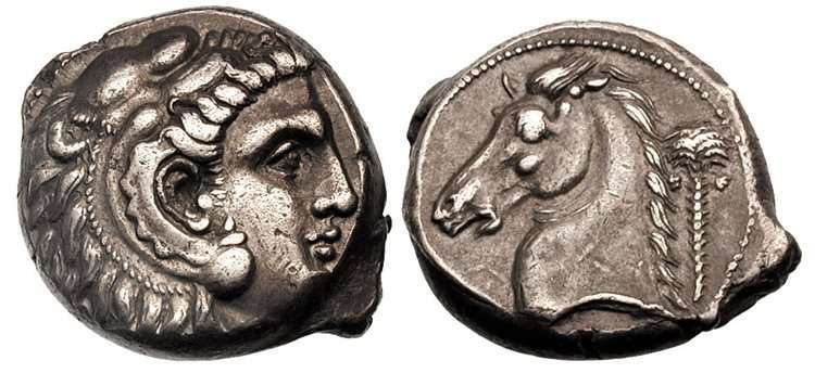 | Jenkins 387 | Siculo-Punic. 300-289 BC. AR Tetradrachm. Head of Hercules in lion skin / M Ch Sh B M in punic script under horse head left. Jenkins 387 (O.119/R.317).