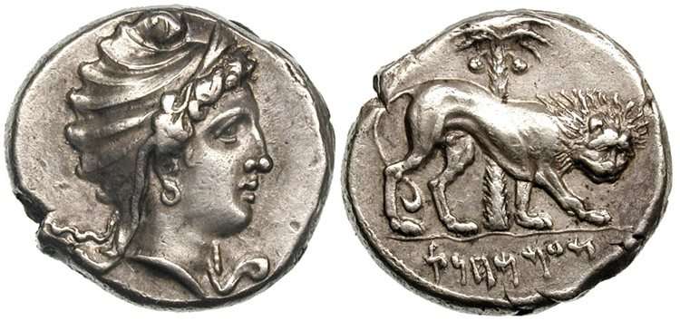 | Jenkins 272 | Punic Sicily, Machanat AR Tetradrachm. ca 320 BC or a few years later. Head of Dido right, in pleated Phrygian tiara and hoop earring / Lion walking right, palm tree in background, Punic legend sh'mmhnt (people of the camp) below. Kraay-Hirmer 208.