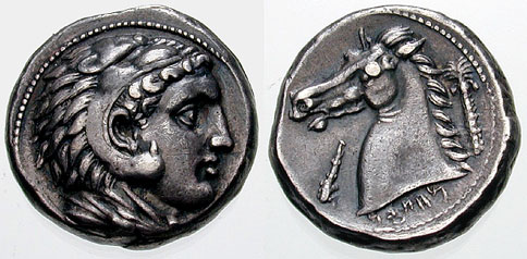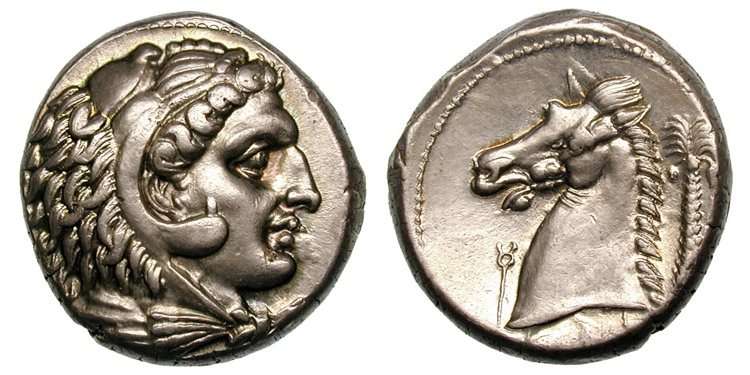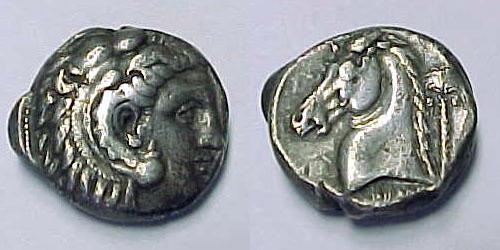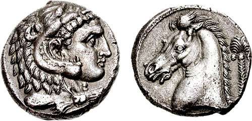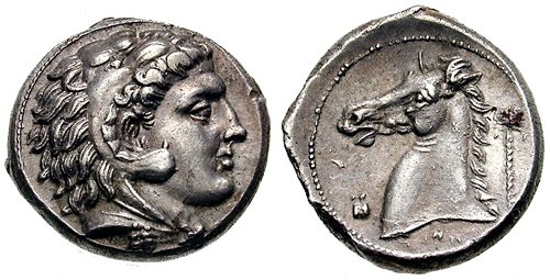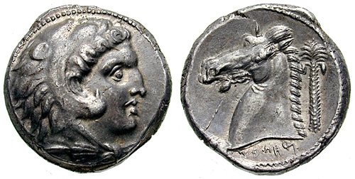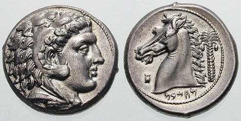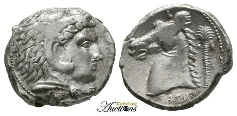 | Jenkins 349 | Punic Sicily, Mechasbim AR Tetradrachm. ca 300 BC or later. Head of young Heracles right in lion skin headdress / Horse head left, kerykeion before, palm tree behind, Punic legend mhsbm (quartermaster) below.