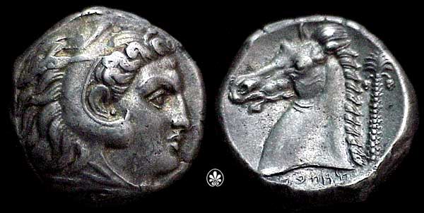 | Jenkins 142 | Carthaginians In Sicily. 350-325 BC. AR Tetradrachm, 26mm. Head of Tanit left, surrounded by dolphins / Horse's head left, palm tree behind. Punic "m" below. Jenkins 142; Sear 6434. | Text | Image |