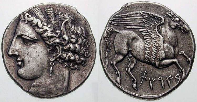 | Jenkins 437 | Siculo-Punic, ca. 264 BC. AR dekadrachm. 41.53 gr, 36.69 mm. Female head left, with two corn-ears and leaf in hair, single drop earring, no necklace. / Pegasos flying right, leading edge of wing with rounded corner overlapping the neck with curved indentation below, two main rows of feathers. Punic legend B'RST below. Jenkins 437; SNG Copenhagen 180. | Text |  |