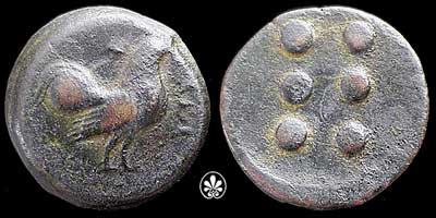 | SNG ANS 532 | Sicily, Siculo-Punic. Ziz mint. Before 405 BC. AE Hexas. Rooster; Ziz / Six pellets. SNG ANS 532 (Panormos).