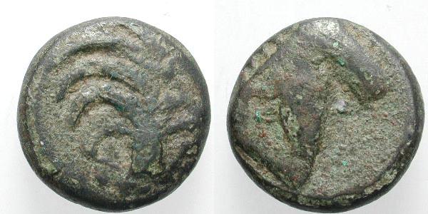 | Lindgren 626 | Sicilo-Punic AE 18. Zeugitana. Palm tree with two dates / horse's head right. Acquaro 148.