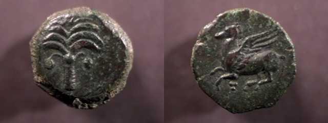| SNG Cop 1018v | Sicilo-Punic, AE15, (3.50g) 4th-3rd century BC, Palm tree. / Pegasus flying left, three pellets below.