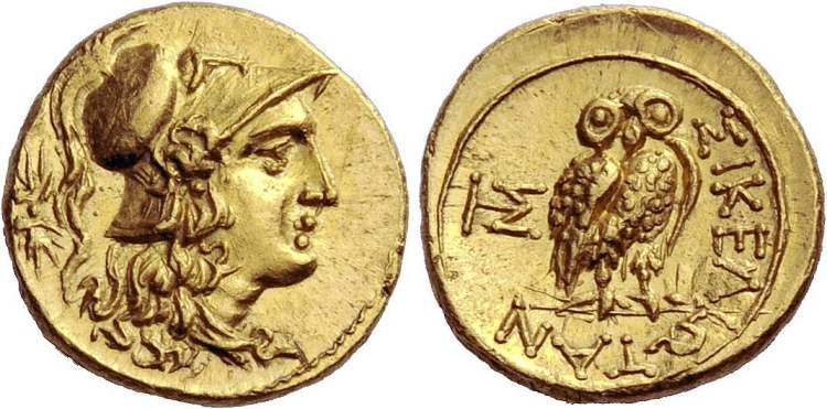 | Hoover HGC 907 | Sicily. The Sikeliotes, AV 25 litrae or quarter-stater. 12mm, 2.07 g. Morgantina mint. Head of Athena right, wearing crested Corinthian helmet; two dots behind neck, thunderbolt behind head / ΣIKEΛIΩTAN, Owl standing half right, head facing, wings closed. TIΣ or HΣ monogram in right field. Hoover HGC 907 (this coin) otherwise unpublished. | Text | Image |