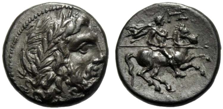 | Hoover 912 | Sicily. The Sikeliotes, Morgantina. 214-213 BC. AR 2 Litrae, 13mm, 1.93 g. Laureate head of Zeus right / ΣIKEΛIΩTAN, horseman galloping right, holding spear; HΣ monogram above. Hoover HGC 912; SNG ANS 1169. | Text | Image |