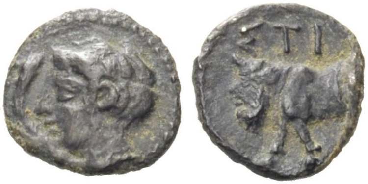 | Hoover 1272 | Stiela, Sicily, AR hemilitra, 8mm, 413-405 BC, 0.34 g. Laureate youthful head of river-god left, reed before head / ΣTI, forepart of man-headed bull left. Hoover HGC 1272; SNG ANS 1367. | Text | Image |
