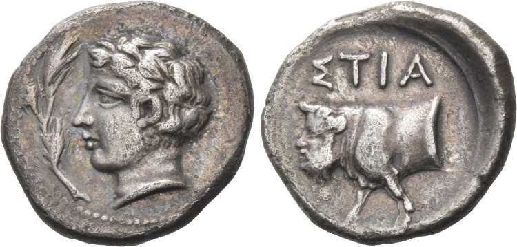 | Hoover 1273 | Stiela, Sicily, AR Drachm, 415-400 BC, 4.02 g. Laureate youthful head of river-god left, reed before head / ΣTIA, forepart of man-headed bull left. Hoover HGC 1273; Mirone, 3, 3; Rizzo 60, 16; AMB 420. | Text | Image |