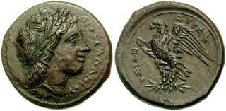 | Calciati 172v | Syracuse, Sicily. Hiketas. c287-278 BC. AE 22mm. Youthful laureate head of Zeus Hellanios left / Eagle standing left; A in left field. SNG ANS 797. | Text | Image |