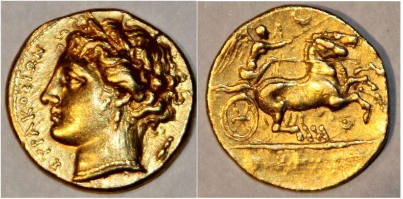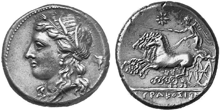 | BMC 439 | Syracuse, Sicily, attic tridrachm or 15 litrae, struck under Hiketas, 288-278 BC. 12.56 g. Head of Persephone-Kore left, wearing wreath of corn and earrings. Bucranium behind head / ΣYΡAKOΣIΩN, Nike, holding goad and reins, in quadriga galloping left. Eight-rayed star above. BMC 439. | Text |  |