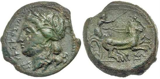 | Calciati 124 | Syracuse, Sicily. Hiketas, AE21. 287-278 BC. 7.75 g. (ΣYΡAKOΣIΩN), Head of Persphone left, wreathed with corn. / Charioteer, holding kentron and reins, driving galloping biga right, triskeles below. Calciati 124; Hoover HGC 1466. | Text |  |