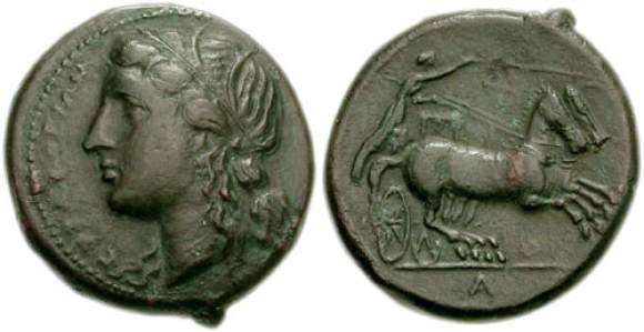 | BMC 441ff | Syracuse, Sicily AE15. 287-282 BC. Head of Persephone left wearing earring & necklace / charioteer driving fast biga right, triskeles beneath horses' forelegs.