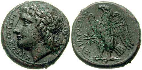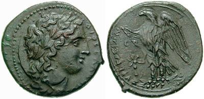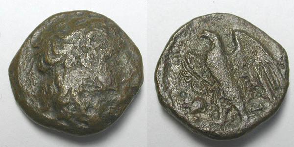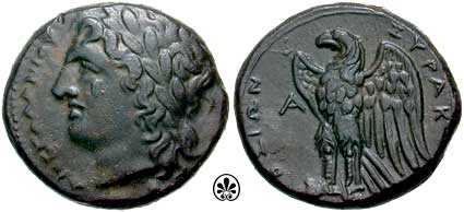 | Calciati 172v | Syracuse, Sicily. Hiketas. c287-278 BC. AE 22mm. Youthful laureate head of Zeus Hellanios left / Eagle standing left; A in left field. SNG ANS 797. | Text |  |