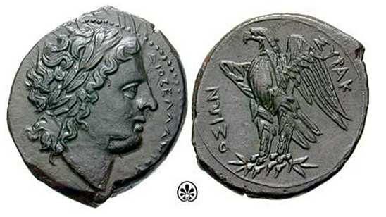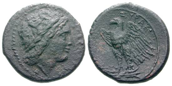 | SNG ANS 790 | Syracuse, Sicily. AE23. (ΔIOΣ EΛΛANOIY), laureate head of Zeus Hellanios right / ΣYPAK-(OΣION) eagle left on thunderbolt. | Text |  |