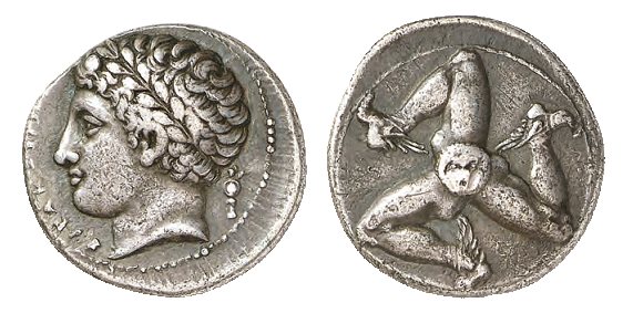 | BMC 353 | Late Third Democracy or early in the reign of Agathokles, AR Drachm 4.12 g, struck ca 317/316. ΣYΡAKOΣIΩN, Laureate head of youthful Ares left; behind, Palladium / Triskeles of three human legs with winged feet left; gorgoneion at the centre. Basel 503; BMC 353; Jameson 864 = KF 229 (this coin); Imhoof MG 73. | Text | Image |