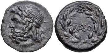 | Hoover HGC 1697 | Sicily, Uncertain mint, AE16, Magistrate Naso... ca 200-190 BC. 2.46 g. Laureate head of Zeus left / NASO within wreath. BAR Issue 38; CNS 81 (Panormus); Hoover HGC 1697. | Text | Image |