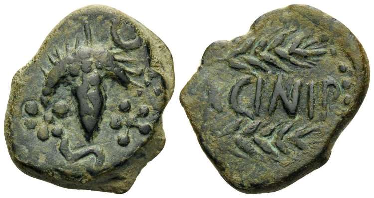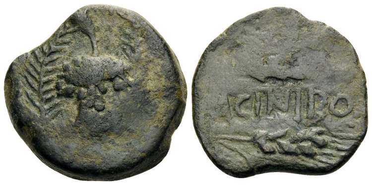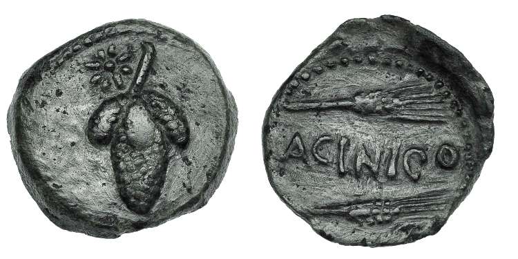 | ACIP 2454 | Acinipo, Spain, AE As. 6.25 g. Bunch of grapes, two stars above. / ACINIPO between two corn-ears. ACIP 2454; Burgos (1987) 938-939; Villaronga 105-5. | Text |  |