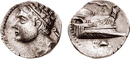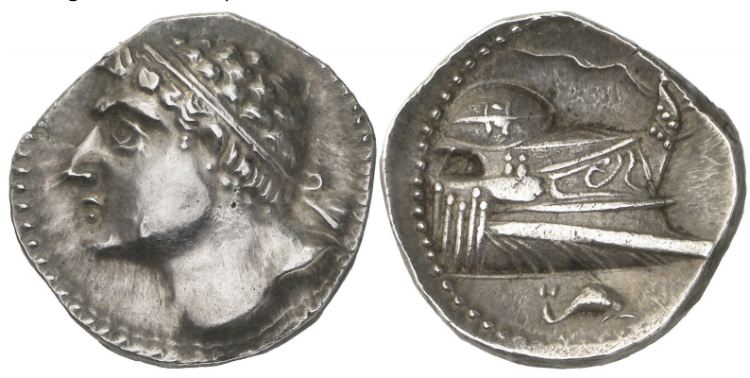BMC Spain 91 | Barcids, Carthaginian occupation of Gades, AR Shekel, ca. 237-209 BC. 7.17g. Struck at Carthago Nova. Diademed, male head (Hamilcar? left. / Prow of galley to right, shield on its deck, dolphin right below. BMC Spain 91; Villaronga, MHC 19; Villaronga, CNH 10; SNG Cop. Supp. 1332. | Text | Image |