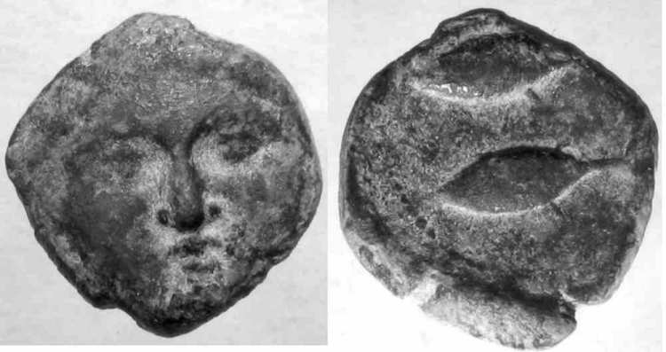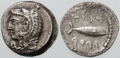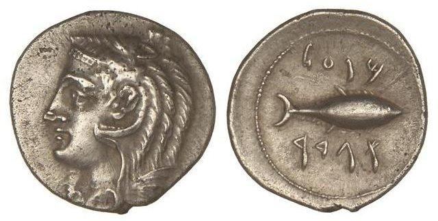 Burgos 1308 | Gades, Spain, AR hemidrachm 2.24 g. 200-100 BC. No legend, head of Melquart left, wearing lionskin headdress / Legend above and beneath tunny fish right. Burgos (2008) 1308. | Text | Image |