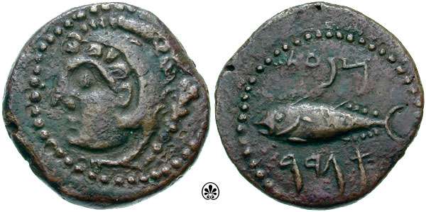 Laffaille 32 | Gades, AE small unit. 3.1 g. 45 BC-AD 45. Head of Melqart or Herakles left, wearing lionskin headdress. / Punic legend, two tunny fish swimming left. Aleph and dot in crescent in fields. Laffaille (Celtic and Roman) Collection, 32 (this coin); Guadan "Les monnaies de Gadès", 96. | Text | Image |