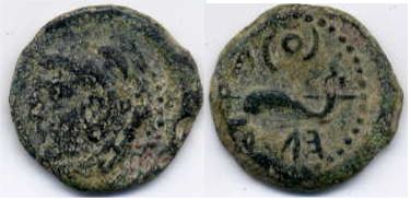 Burgos 1352 var | Gades, AE Quadrans 3,92 gm. 16,5 mm. Head of young Herakles left, wearing lionskin / Punic letters, dolphin swimming left. Burgos (2008) 1352 var. | Text | Image |