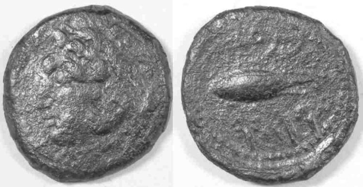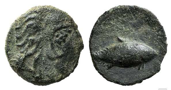 Mionnet 97 | Gades, Spain, late 3rd century BC. AE 12mm, 1.41g. Head of Herakles right, wearing lionskin headdress / Fish right. Mionnet I, 97; cf. AB 1318. | Text | Image |