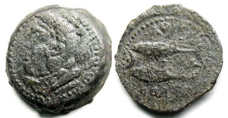 Burgos 1339 | Gades, Spain AE As 13,42 gr. 28 mm. Head of young Herakles left, wearing lionskin / Punic legend, 2 tunny fish swimming left. Burgos (2008) 1339. | Text | Image |