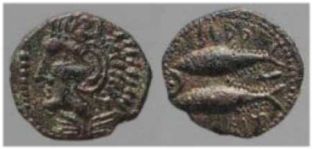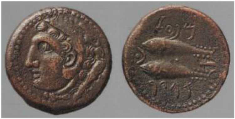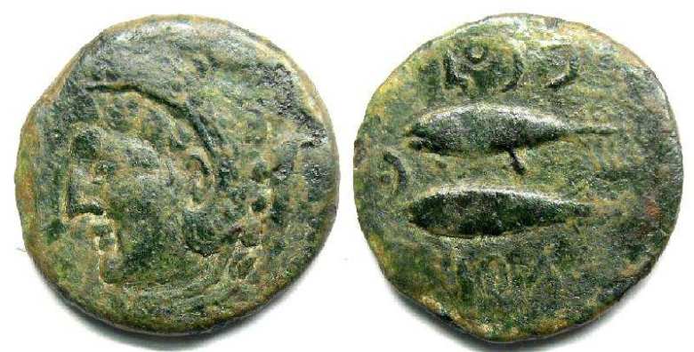 Burgos 1343 | Gades, Spain, AE As 6,72 gr. 24,5 mm. Head of young Herakles left, wearing lionskin / Punic legends, 2 tunny fish swimming left. Burgos (2008) 1343. | Text | Image |